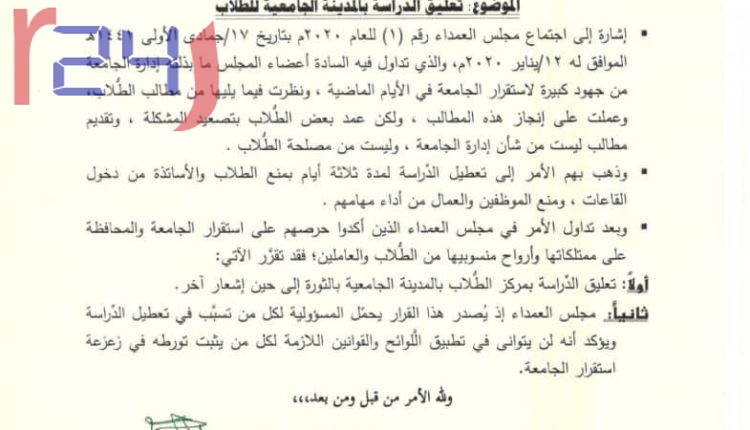 وحمّل مجلس العمداء المسؤولية لكل من تسبب في تعطيل الدراسة، قاطعاً بأنه لن يتوانى في تطبيق اللوائح والقوانين اللازمة لكل من يثبت تورطه في زعزعة استقرار الجامعة.