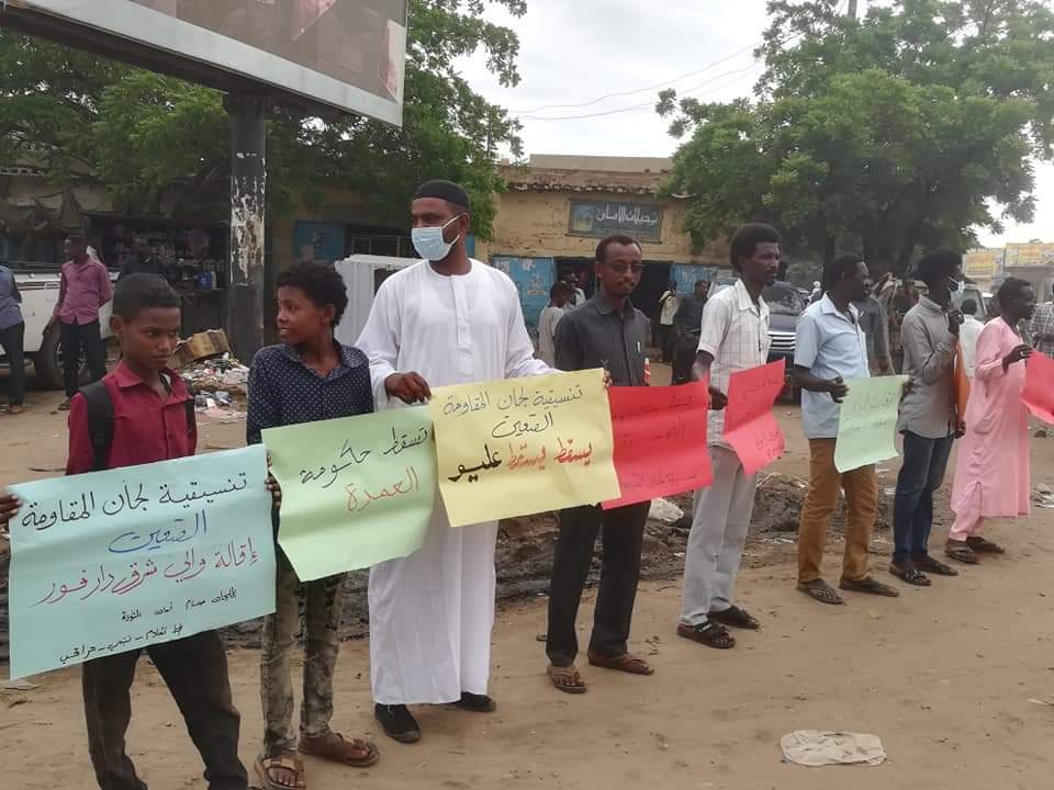 نظمت تنسيقية لجان المقاومة بمدينة الضعين اليوم- الاثنين- وقفة احتجاجية رافضة لاعادة تعيين دكتور محمد عيسى عليو والياً بالولاية، رافعين شعارات تنادي باسقاط الوالي الحالي.