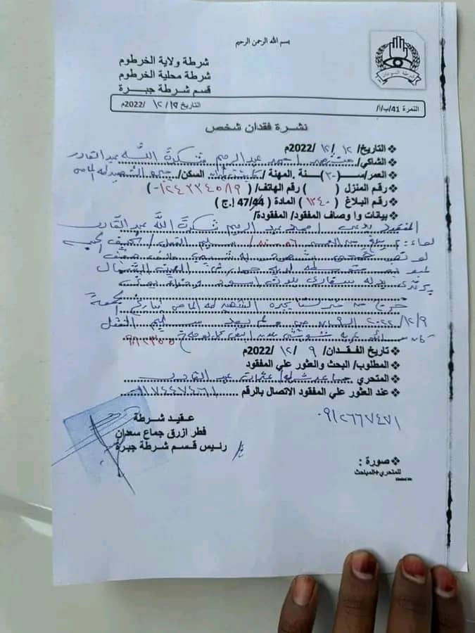 اصدرت شرطة ولاية الخرطوم نشرة فقدان اللواء ركن أحمد عبد الرحيم شكرت الله بموجب بلاغ دونته أسرة المفقود بالرقم 1340 تحت المادة 47/44 من القانون الجنائي السوداني.