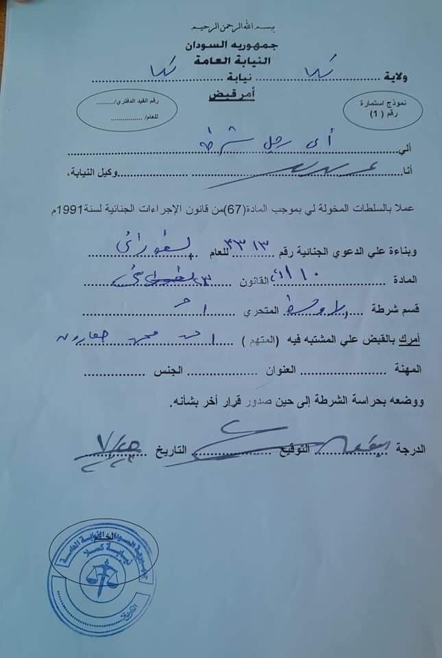 كسلا- دارفور24 اصدرت النيابة العامة بولاية كسلا امرا بالقبض على عدد من قيادات النظام البائد بناء على دعوة جنائية بالرقم 3313. وشمل أمر القبض- الذي اطلعت عليه دارفور24- كل من رئيس المؤتمر الوطني احمد محمد هرون، ونائب رئيس الجمهورية الأسبق على عثمان محمد طه، والقيادي عوض الجاز. وبعدأكمل القراءة
