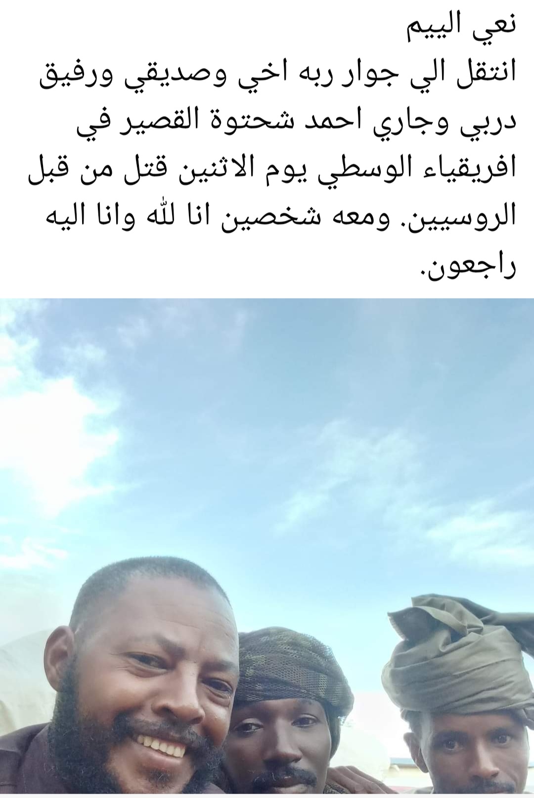 One of the Sudanese working in gold mines in Central Africa, Hussein Abu Nidal, told Darfur 24 that his friend Ahmed Shahtowa was killed with three other Sudanese by Russian forces near the Andha mine near the Sudanese border.